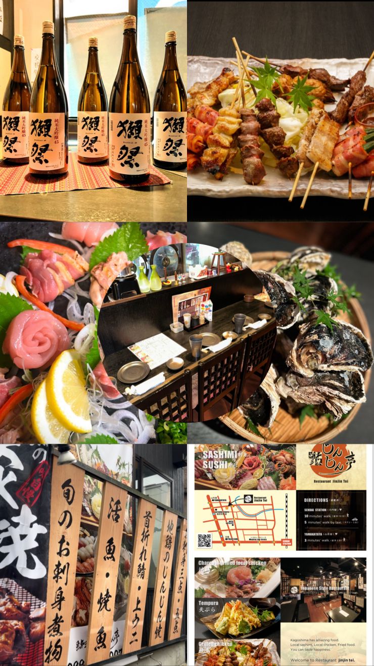 毎朝市場から届く 新鮮な魚介類のお造りや寿司、炭火で香ばしく焼き上げる 霧島地鶏の焼き鳥、そして冬にふさわしい 多彩なコース料理 をご堪能ください。